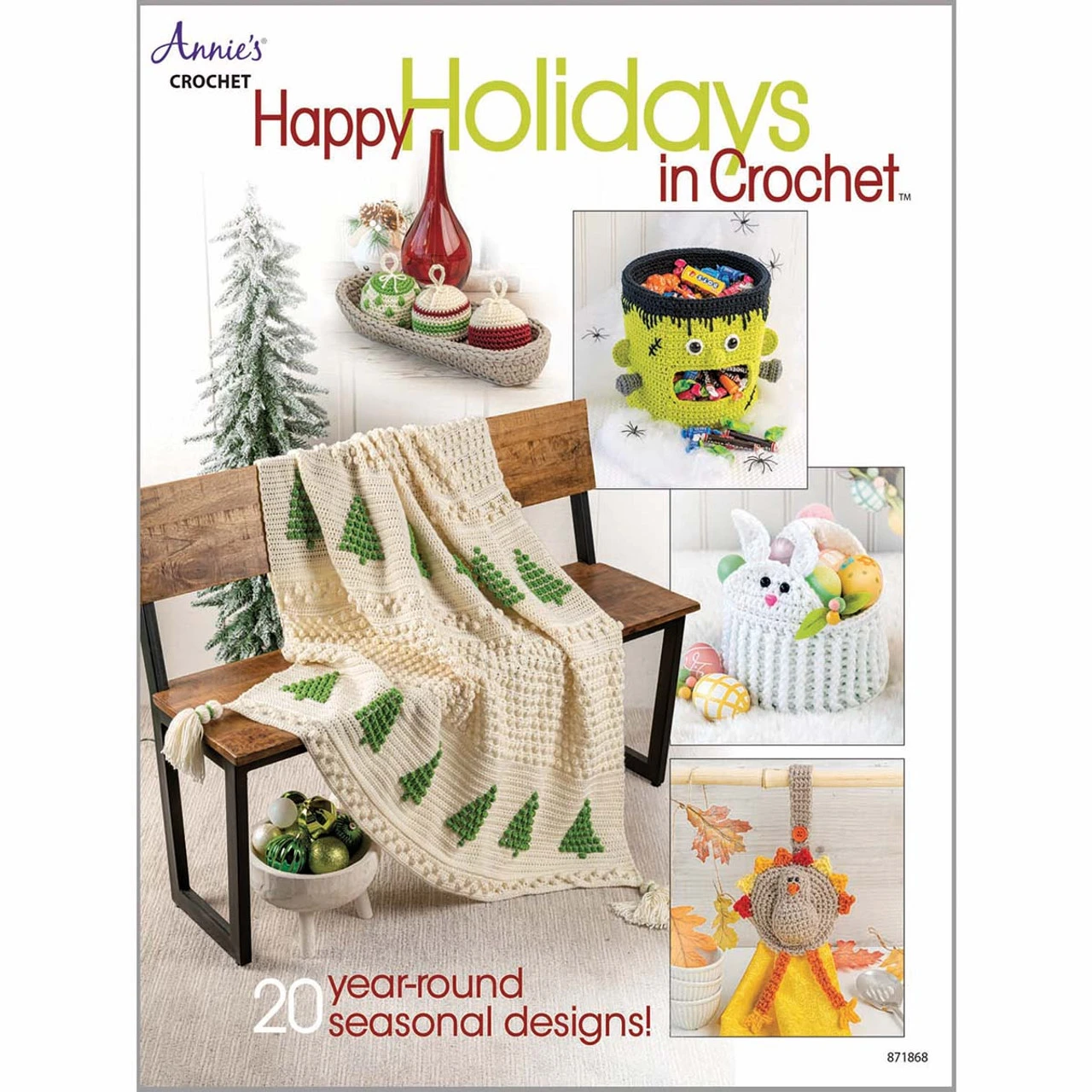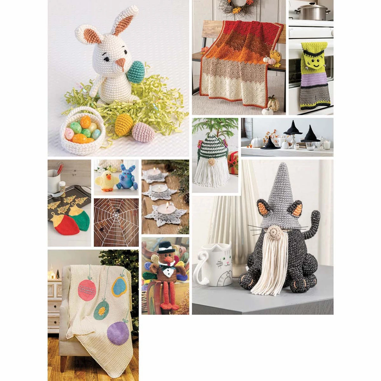 Decorate for the holidays with crochet! This delightful collection of 20 crochet designs includes projects inspired by favorite holidays. With traditional and playful designs including bobble Christmas trees, bunny Eater baskets, pilgrim turkeys, a black cat gnome, and beautiful Christmas tree afghan, these designs make great home décor or fun gifts for the holiday.