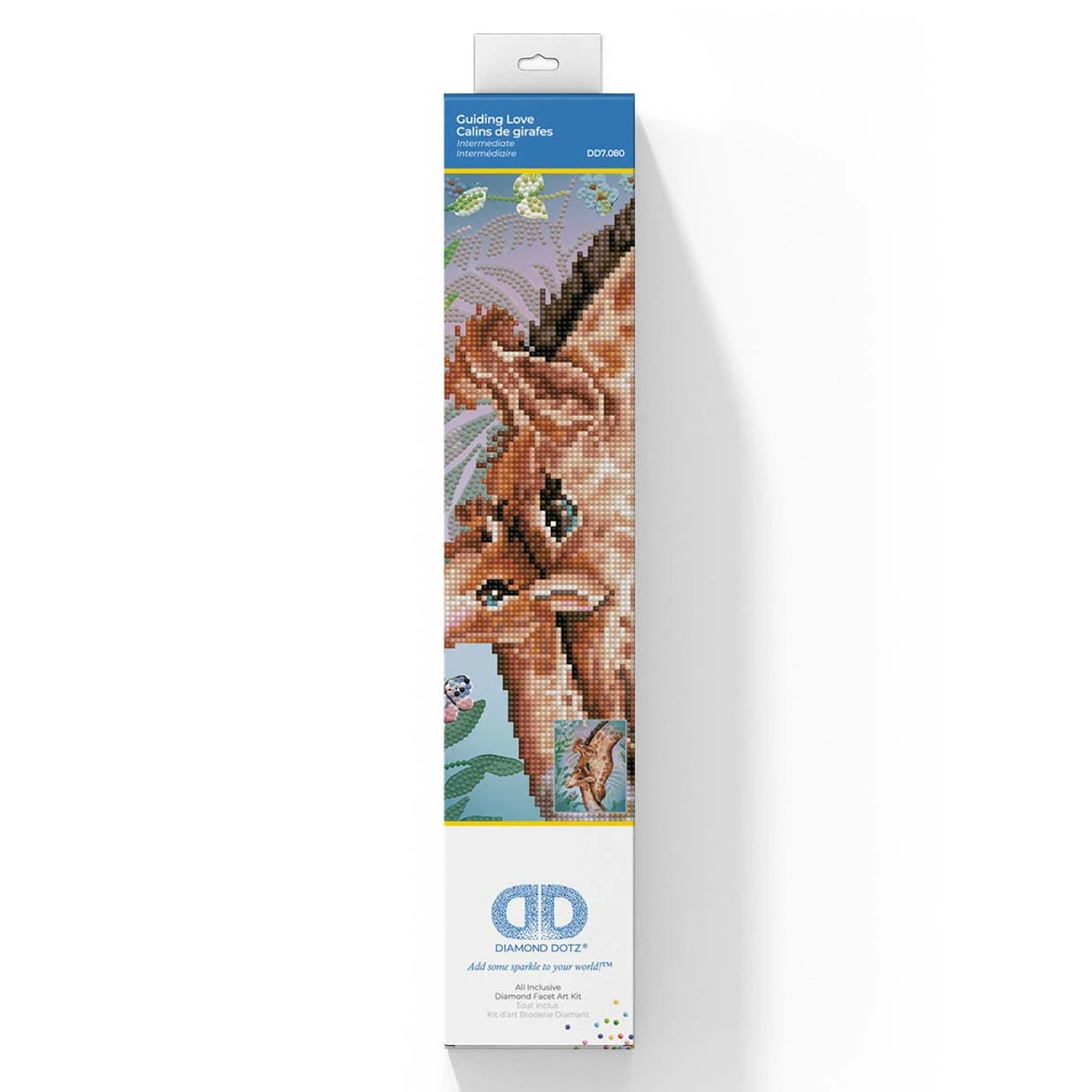 This diamond painting image features a heartwarming scene of a mother giraffe and her young calf. The wildlife portrait shows the tender moment between mother and child framed by leaves, flowers, and butterflies. Fun and easy diamond paintings are created by arranging sparkling gems on a pre-printed canvas, resulting in eye-catching wall art with a dazzling sparkle. Diamond painting kit includes pre-printed canvas, pre-sorted Diamond Dotz round gems, stylus, tray, wax caddy, and instructions. 11 x 14″ (28 x 36cm).