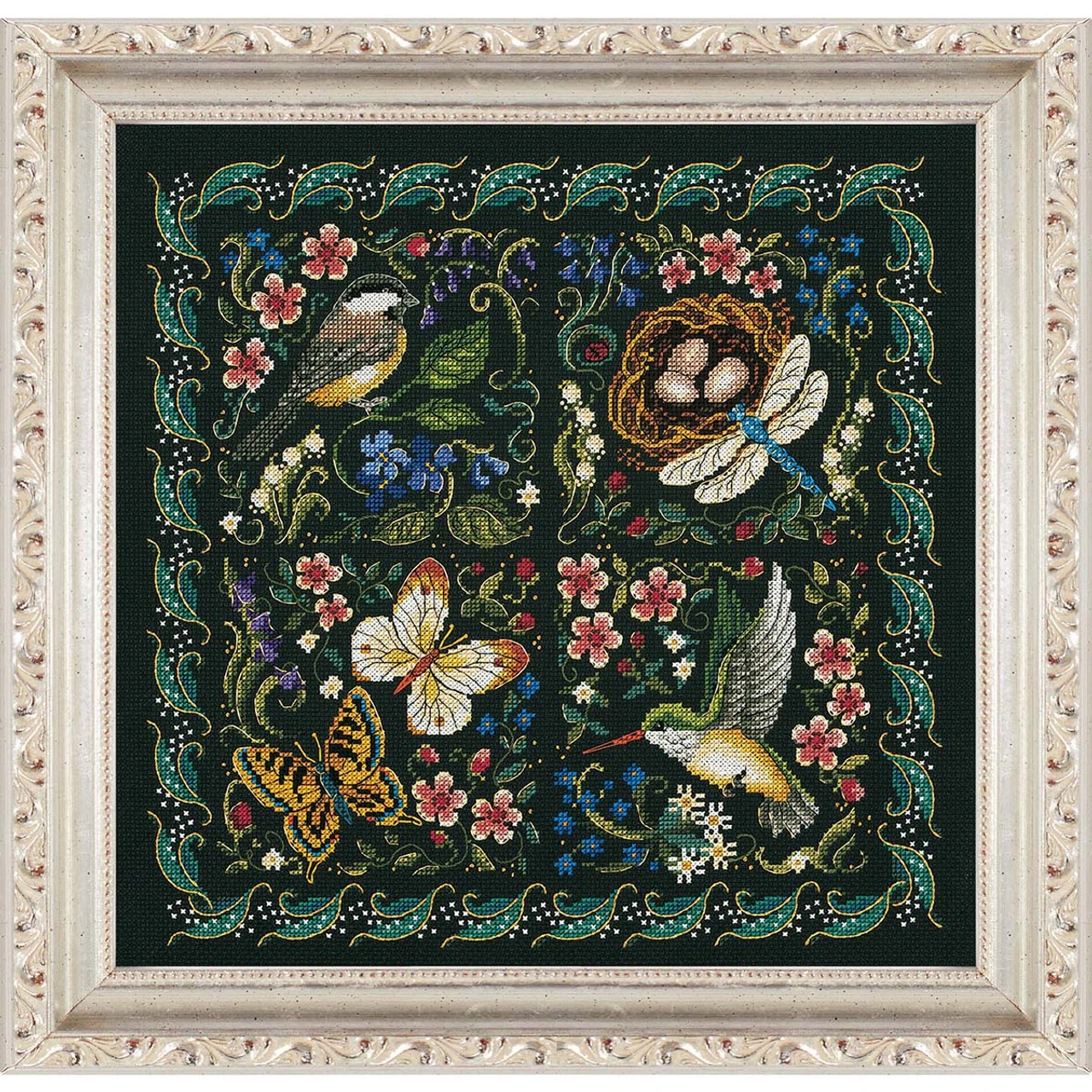 Some of nature’s most beautiful creations—birds, butterflies, and blooms—are featured on this exquisite design. The Finery of Nature from the Gold Collection by Dimensions will make a stunning display in your home. ©Pamela Silin-Palmer 2001. Counted cross-stitch kit includes black 14-ct. Aida fabric, cotton thread, metallic thread, and needles. 14 × 14″ (36 x 36cm).