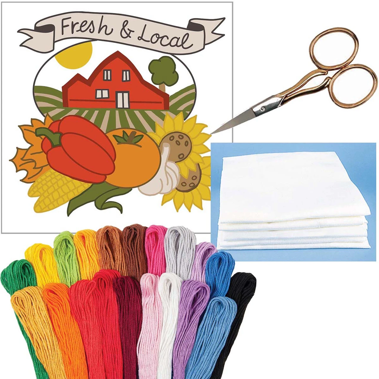 Get 20 FREE skeins of floss when you buy this holiday bundle including everything you need to embroider a set of towels with charming farmers’ market designs! This complete embroidery set includes 7 premium flour sack towels, DMC scissors, a set of 10 iron-on transfers, and a FREE floss pack including 20 skeins of Craftways Floss in the most-popular colors. The transfer designs feature motifs fresh from the farmers’ market like produce stands, baskets of apples and vegetables, and signs advertising fresh produce. Simply follow the instructions with the transfers to iron the designs onto the included flour sack towels, then use the FREE floss to stitch the designs in the colors of your choice to create a fun coordinated set perfect for a Christmas gift—or to keep for yourself! You can mix and match the designs for endless design possibilities!