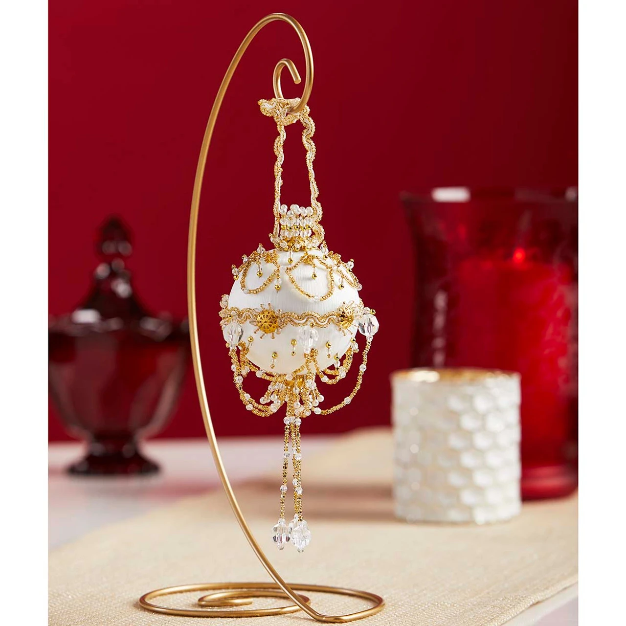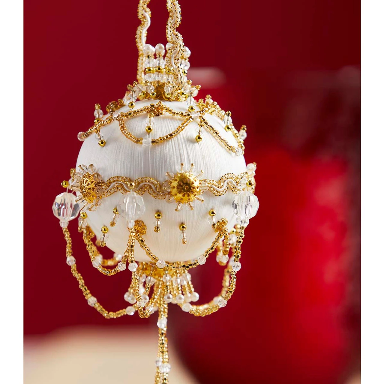 This exclusive Herrschners Collector’s Ornament was designed for Herrschners’ 120th anniversary in 2019. The white bauble is gilded with golden beads and trims, with chandelier-inspired bead strands and a tassel that brings opulence to this sequin and beaded masterpiece. This showpiece ornament is part of the Herrschners Collector’s Ornament Series. The elegantly designed collector’s ornaments take sequin and beaded designs to the next level with intricate arrangements of sequins and beads that make each finished design a keepsake you’ll proudly display year after year.