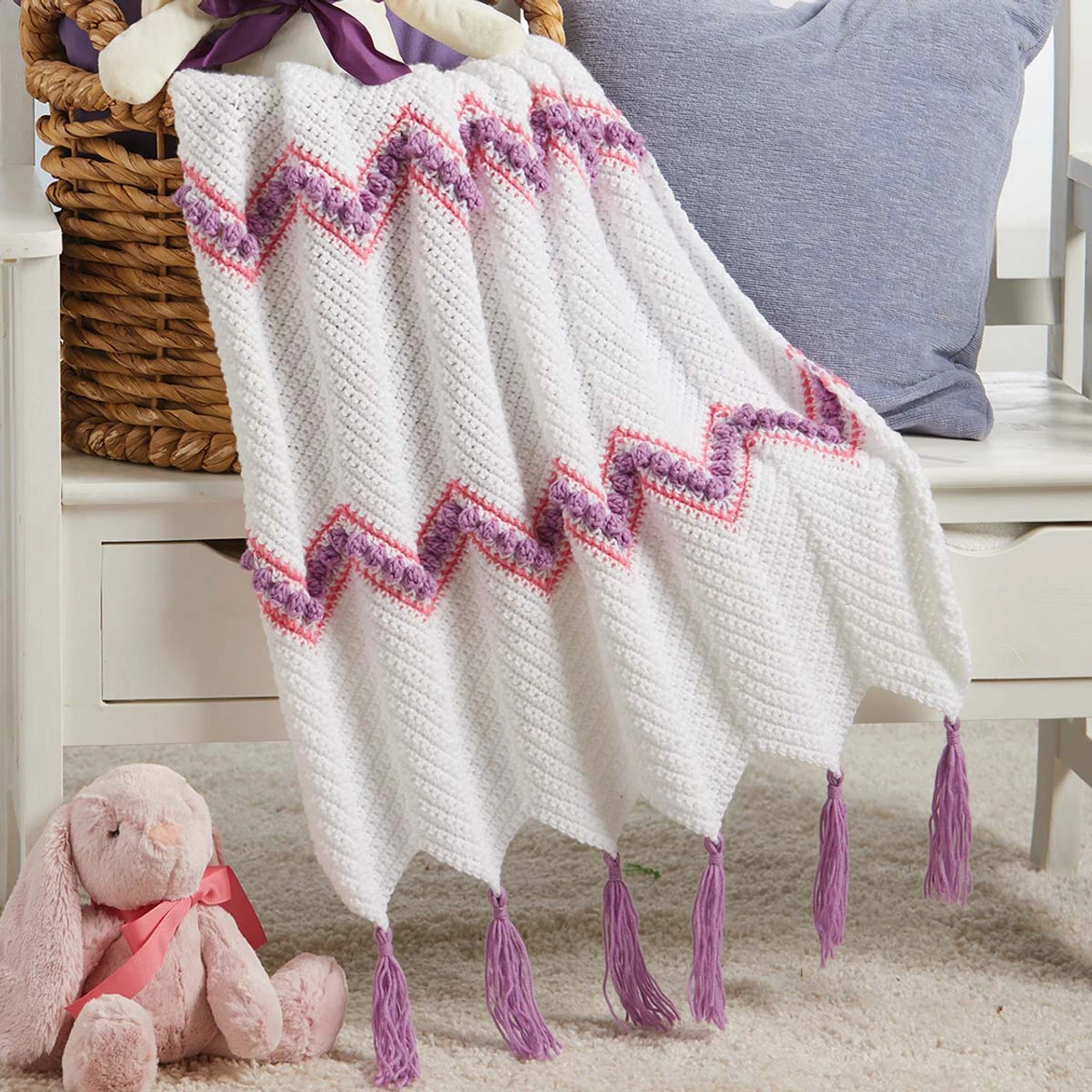 Tassel and striping detail will make this baby afghan the cutest of the bunch! Kit includes Herrschners Worsted 8 Baby Yarn and easy crochet instructions. 28 × 44″ (71 x 112cm). Imported.