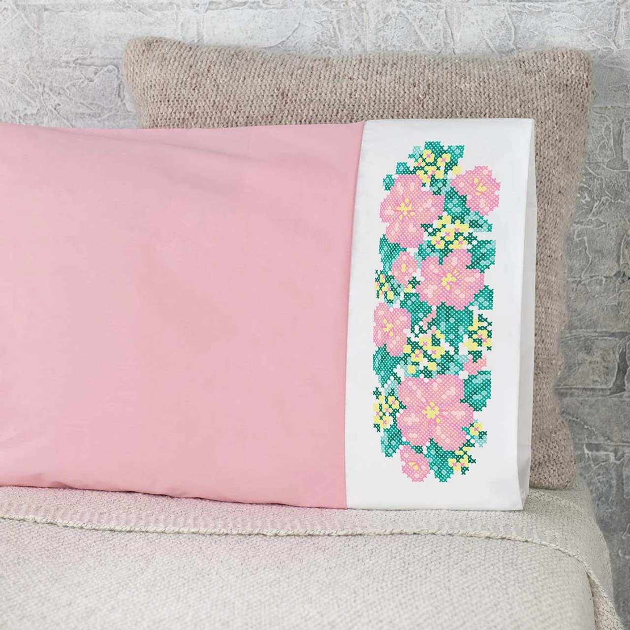 Create a haven of relaxation in your bedroom with beautiful florals. Stamped for cross-stitch on pink polyester/cotton fabric with a white cuff. Set of two. 20 x 30″ (51 x 76cm). Imported.