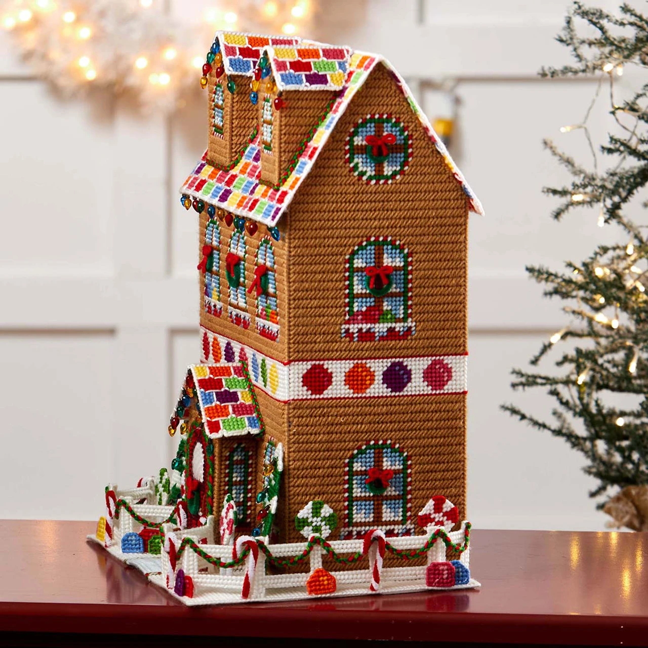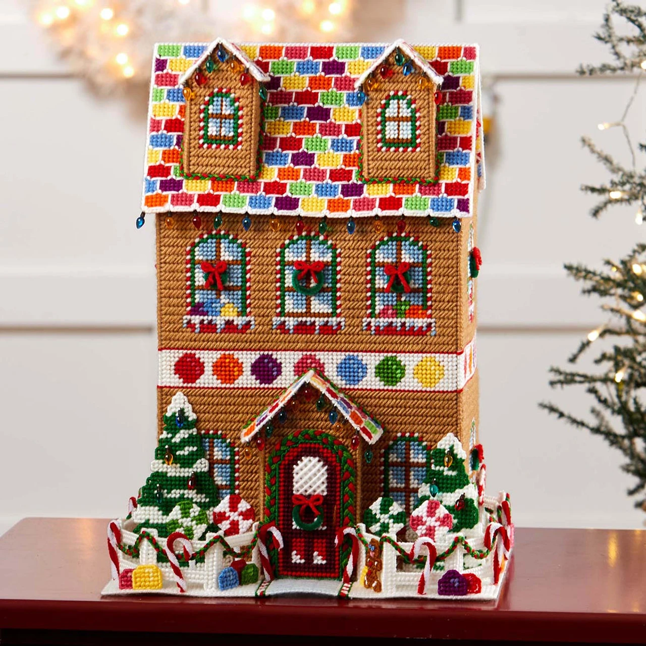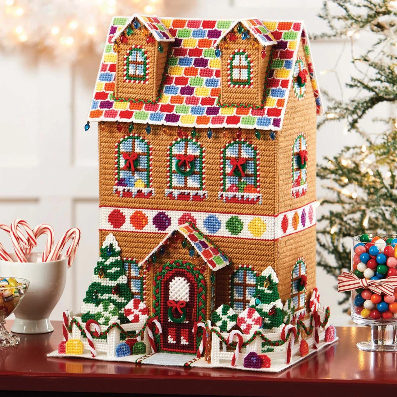 • This plastic canvas gingerbread house is decorated with gumdrops, candy canes, peppermint lollipops, Christmas trees, strings of Christmas lights, and wreaths.