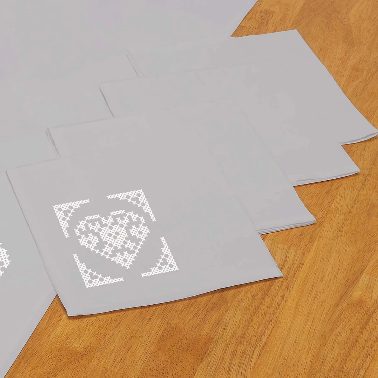 • These napkins are ready for stitching with a heart and geometric border stitched in white.