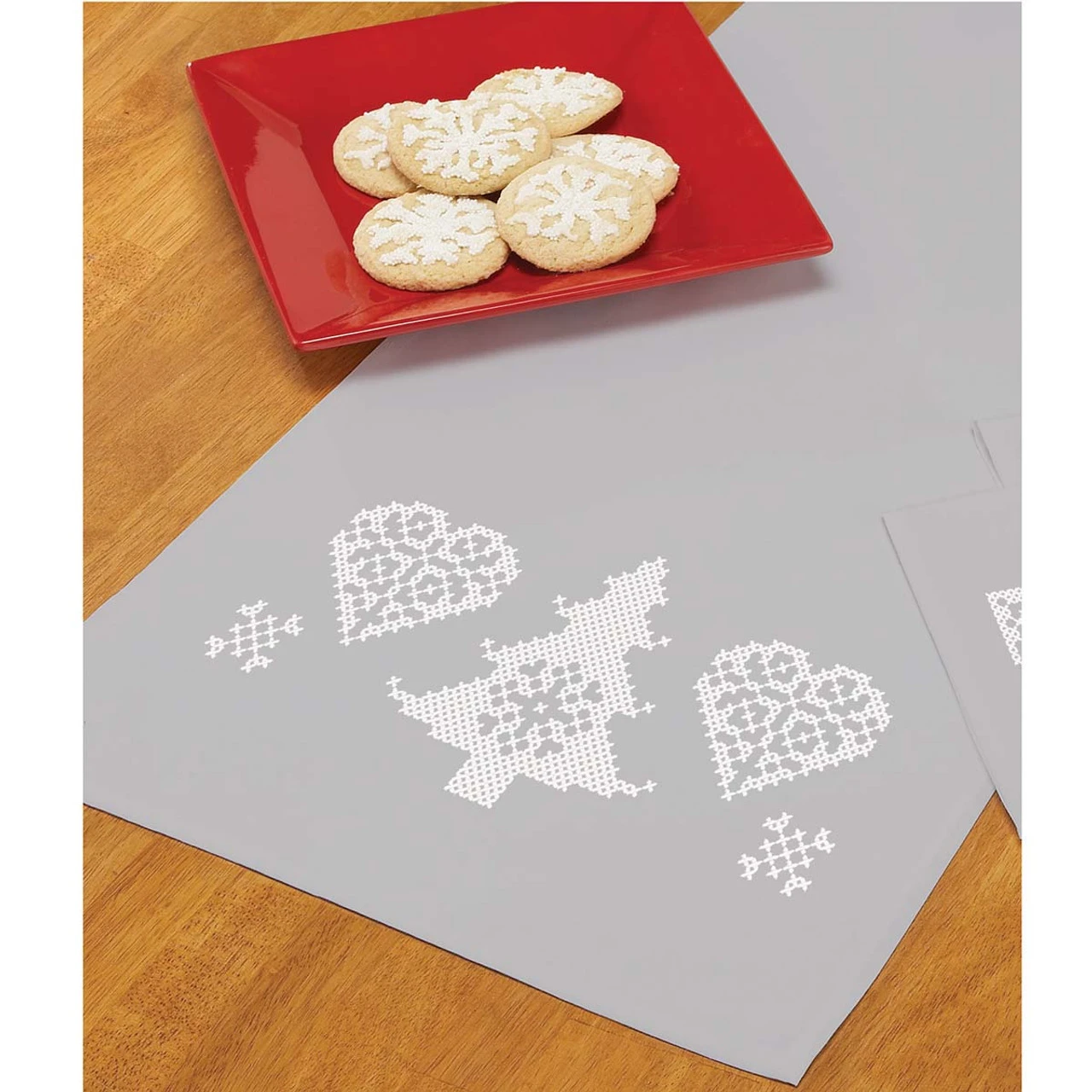 This Christmas table runner is decorated with a white Christmas tree silhouette surrounded by hearts and snowflakes. This cross-stitch design is stamped for stitching on gray polyester/cotton fabric with a perle edge. The 14 x 44″ (36 x 112cm) table runner is pre-finished and ready for stitching. Simply follow the easy-to-read chart and instructions to stitch the designs. Floss and needle are not included. Imported.