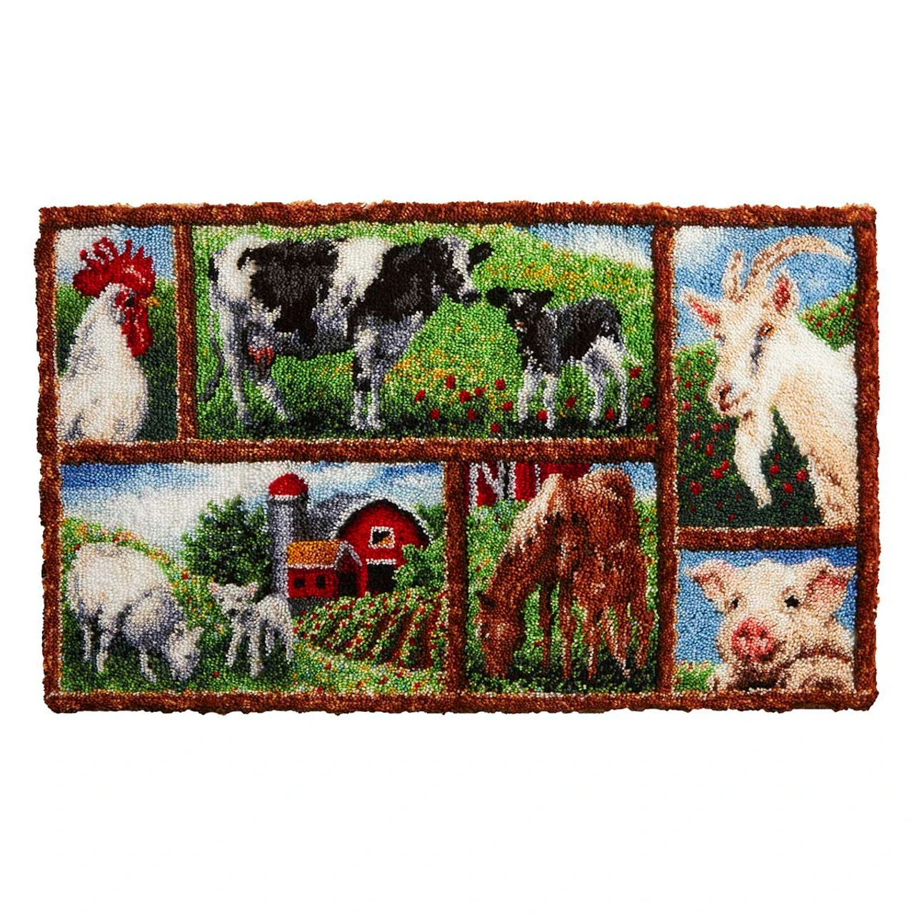 A menagerie of farm animals brings lots of character to your home! Latch hook kit includes 3.75-mesh gridded canvas, lofty pre-cut 100% acrylic yarn, clear vinyl storage bag, and easy-to-follow chart. 50 × 30″ (127 x 76cm). Imported.