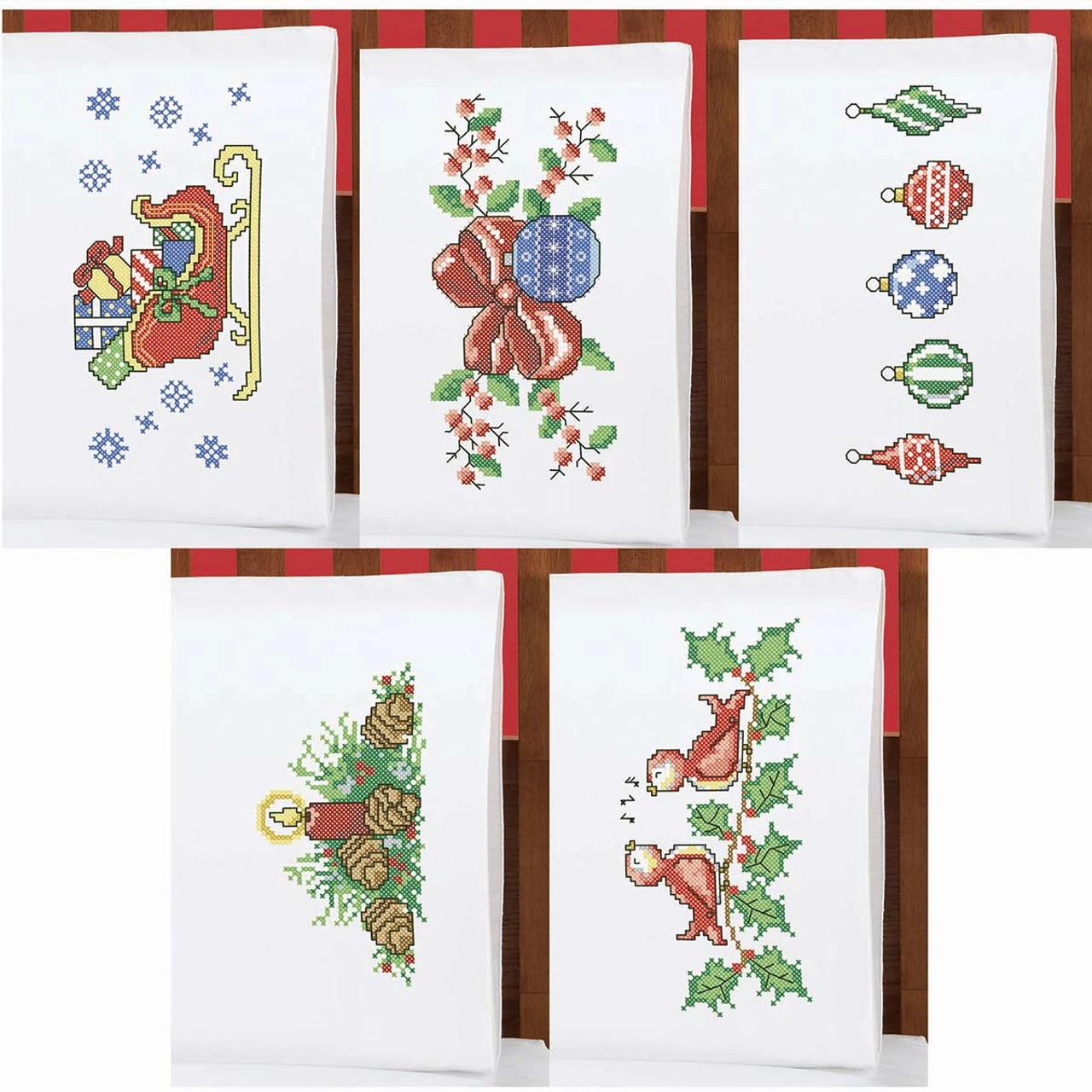 • These pre-finished pillowcases are ready for stitching with Santa’s sleigh with presents and snowflakes, a set of 5 ornaments, a candle with pinecones, a blue ornament with a red bow and red berries, and singing birds perched on a holly branch.