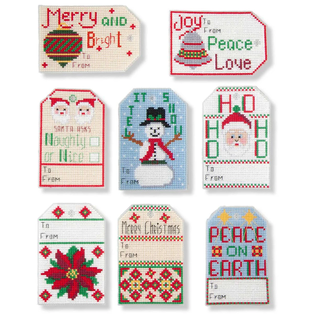Wow family and friends with beautifully wrapped gifts labeled with a hand-stitched tag. Counted cross-stitch kit includes 14-ct. plastic canvas, cotton floss, floss organizer, and needle. 3 × 4″ (7.6 x 10.2cm). Set of eight. Imported.