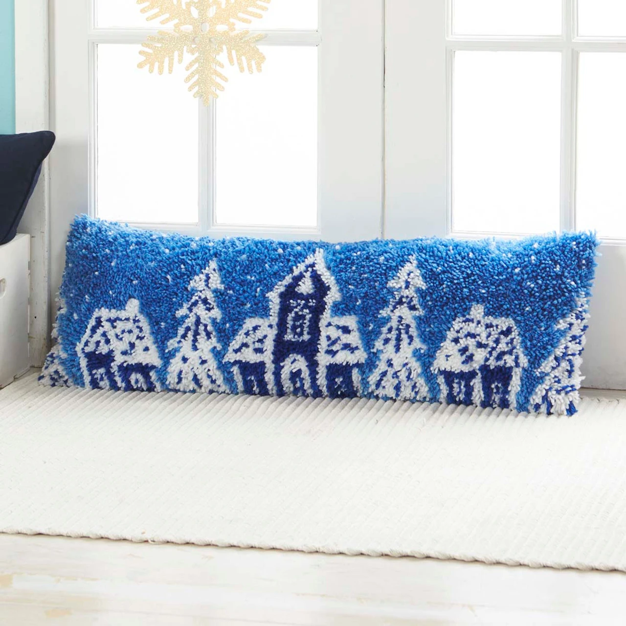 Enjoy a snowy wintertime view without the added chill when you prop this wintry draft dodger in front of your door or window. A fun project for crafters of all ages and skill levels, the higher-gauge canvas of this latch hook project allows for a high level of detail in the finished design. Kit includes 3.75-mesh gridded canvas, lofty pre-cut 100% acrylic yarn, clear vinyl storage bag, easy-to-follow chart, and instructions. Latch hook tool, backing fabric, and fiberfill not included. 36 x 12″ (91 x 30cm). Imported.