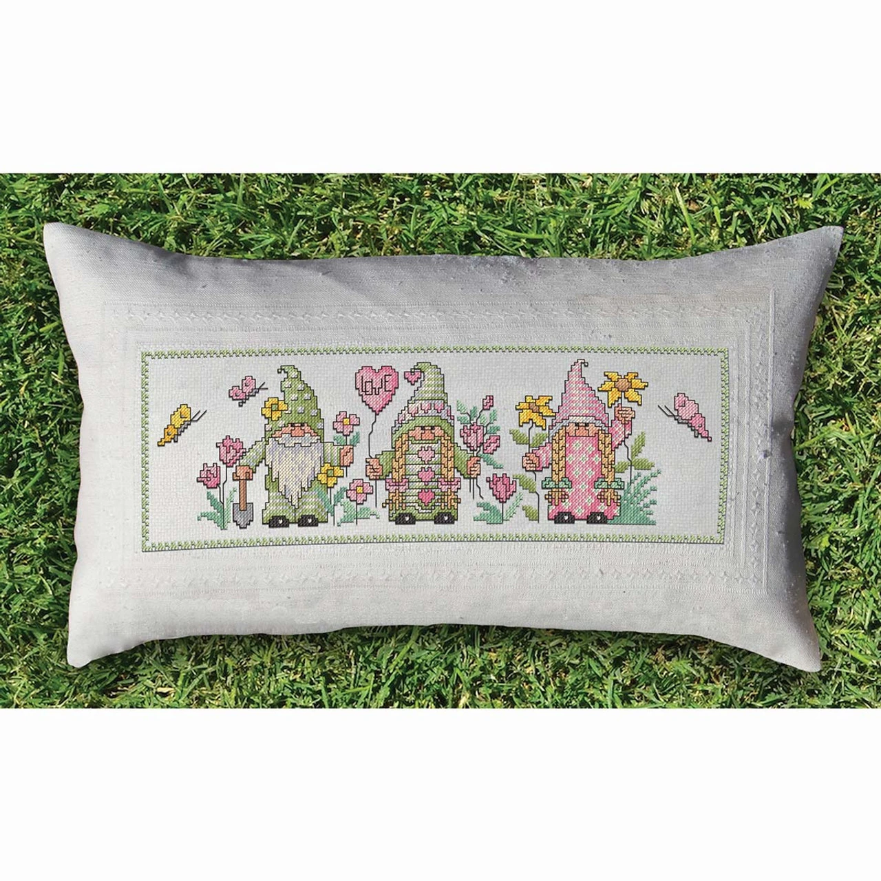 This spring counted cross-stitch pillow features a trio of gnomes enjoying the best of the season as they spend the day in a flower garden filled with pink and yellow blooms. Wearing pastel green and pink clothes, this male gnome and two female gnomes are surrounded by butterflies and holding a balloon with the word Love and a garden spade. This design is stitched on a pre-finished natural-colored 14-ct. aida cloth pillow cover with a zippered backing. The easy-to-see squares of aida cloth make it a great fabric choice for both beginning stitchers and those with more experience. This complete counted cross-stitch kit includes the pre-finished pillow cover, cotton floss, needle, and instructions. Pillow form not included. The finished pillow measures 20 x 11″ (51 x 28cm). Imported from Europe.