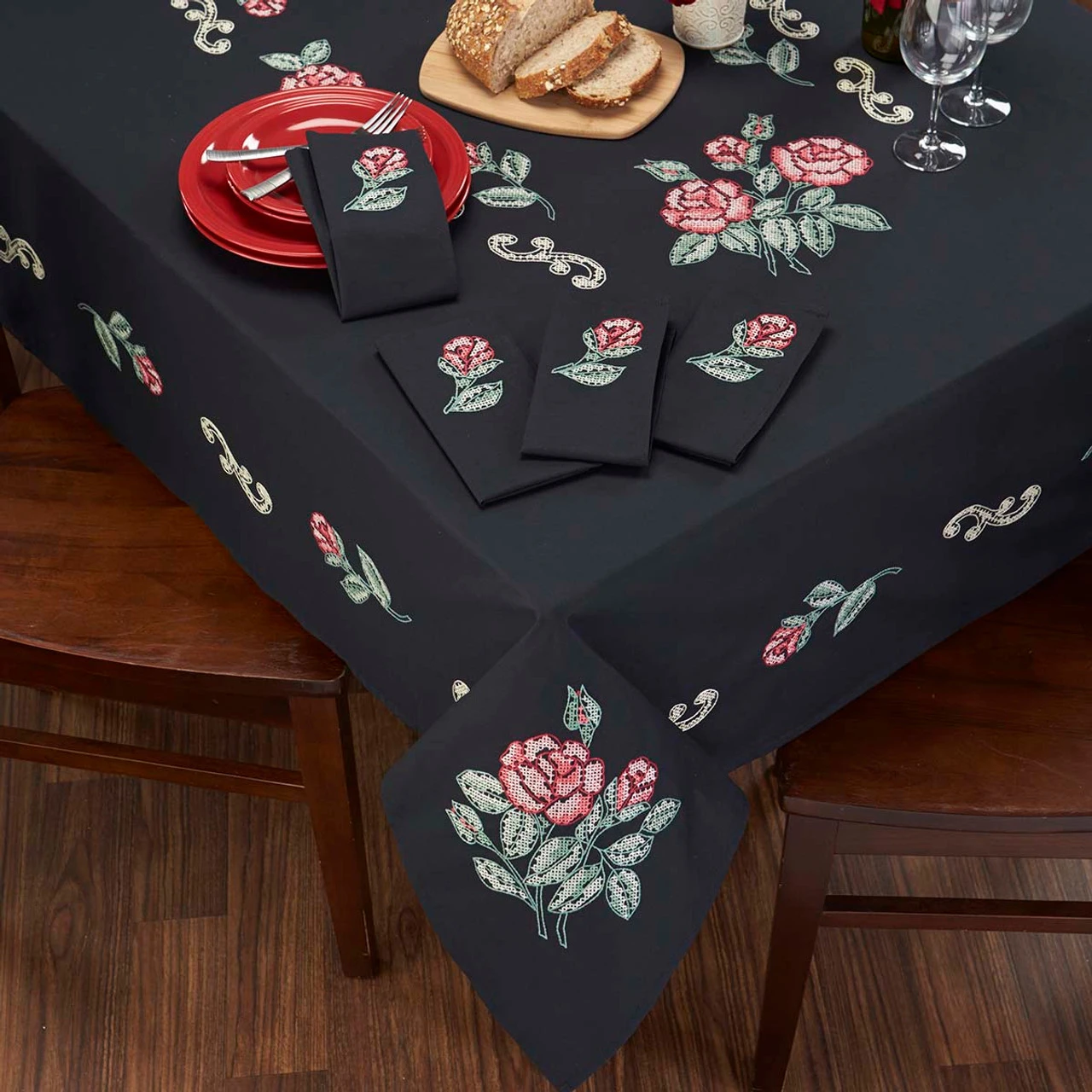 Classic, romantic red and black make for a truly stunning set of table linens. Stamped for cross-stitch on black cotton/polyester fabric with a finished edge. Imported from Europe.