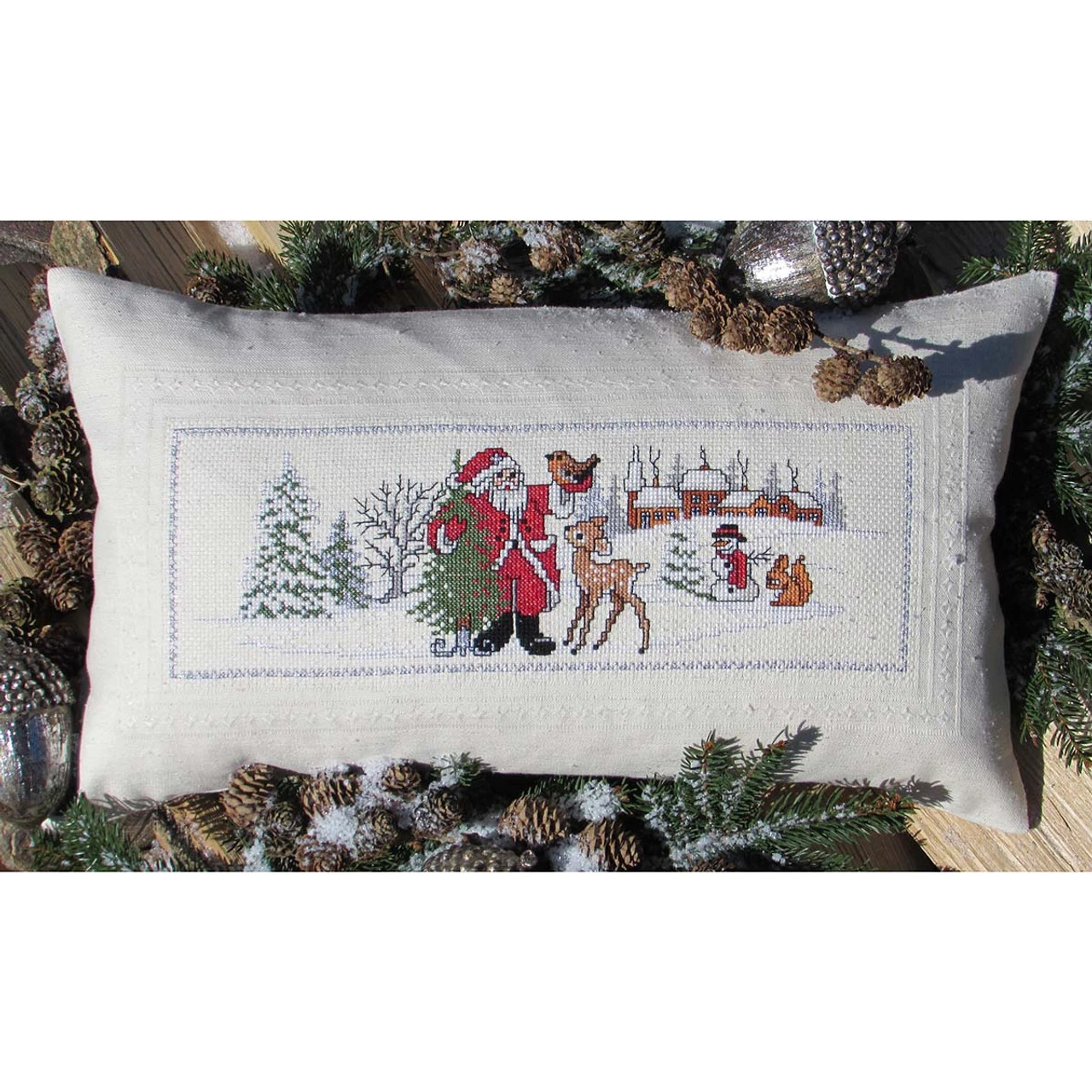 This Christmas counted cross-stitch design features Santa making forest friends as he enjoys a walk on a winter day. The jolly ol’ elf is shown with a robin perched in one hand, a Christmas tree in the other as he greets a curious young fawn. In the distance, a squirrel enjoys a snack next to a snowman as snow-covered trees and a row of houses line the backdrop of this panoramic winter landscape. This design is stitched on a pre-finished natural-colored 14-ct. aida cloth pillow cover with a fabric border and a zippered backing. The easy-to-see squares of aida cloth make it a great fabric choice for both beginning stitchers and those with more experience. This complete counted cross-stitch kit includes the pre-finished pillow cover, cotton floss, needle, and instructions. Pillow form not included. The finished pillow measures 11 x 19″ (28 x 48cm). Imported from Europe.