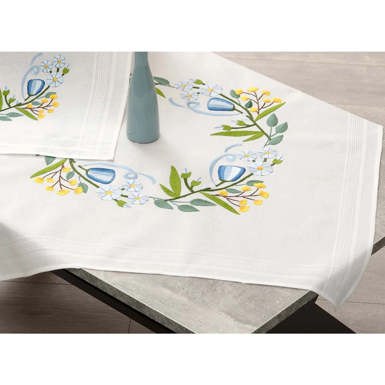 This floral table topper is decorated with beautiful blue and yellow flowers surrounded by green leaves and swirling blue motifs. This embroidery design is stamped for embroidery on white polyester/cotton fabric with a woven edge. The 32 x 32″ (81 x 81cm) table topper is pre-finished and ready for stitching. The kit includes cotton floss, floss organizer, and needle. Simply follow the easy-to-read chart and instructions to stitch the design. Imported from Europe.