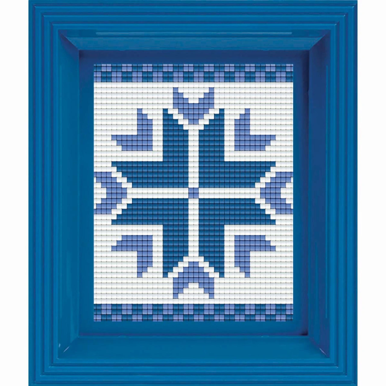 This mini mosaic features a blue snowflake motif inspired by traditional quilt blocks. The small size of the design makes this mini mosaic a great beginning project! Kit includes base plate, colored pixel squares (tiles), plastic frame, and instructions. Tweezers not included. Follow the instructions to arrange the tiles on the base plate and watch the image form piece by piece. Mosaic measures 4 x 5″ (10.2 x 12.7cm).