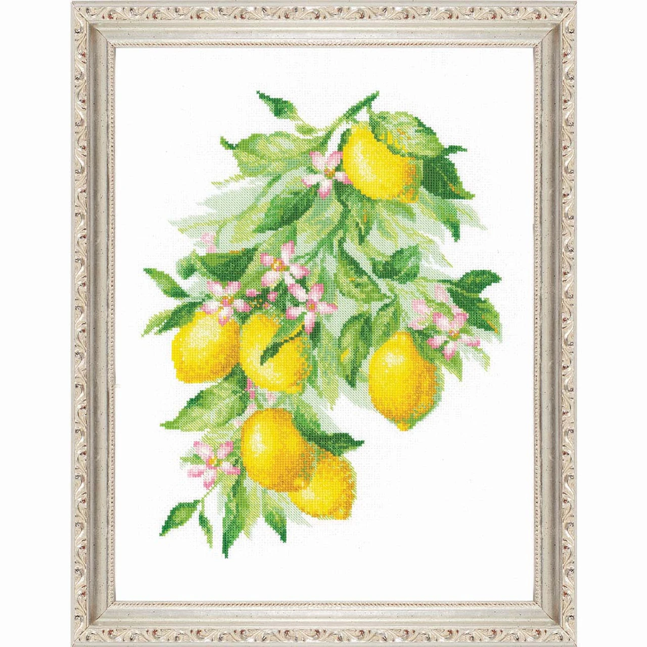 This bright and bold counted cross-stitch design features a view of sunny yellow lemons on a tree branch of watercolor green leaves with little pink and white blossoms. The pretty nature scene brings a burst of sunshine to your spring or summer décor. This design is stitched on white 14-ct. aida cloth. The easy-to-see squares of aida cloth make it a great fabric choice for both beginning stitchers and those with more experience. This complete counted cross-stitch kit includes white Zweigart 14-ct. aida cloth, cotton floss, needle, and instructions. The finished design measures 12 x 16″ (30 x 41cm). Imported from Europe.