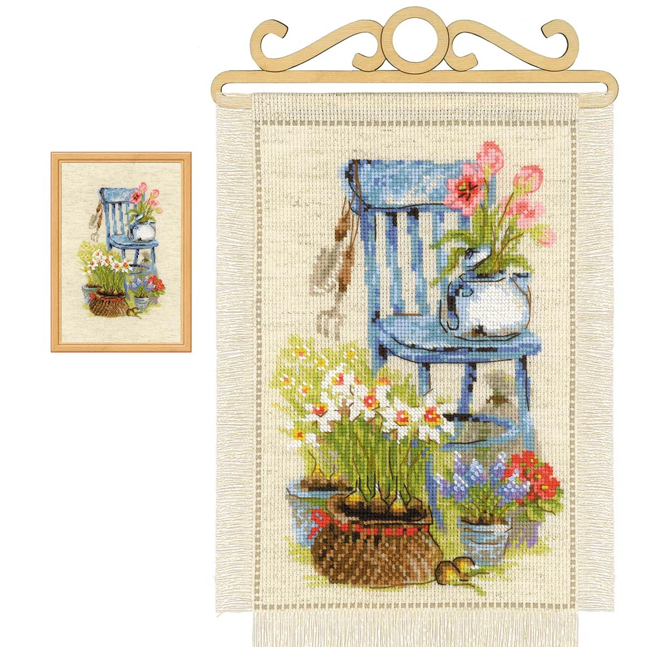 Greet spring with a cheerful garden scene filled with color. Counted cross-stitch kit includes flaxen 14-ct. aida fabric, cotton floss, needle, and wooden hanger. 7¾ x 11¾” (19.7 x 30cm). Imported from Europe.