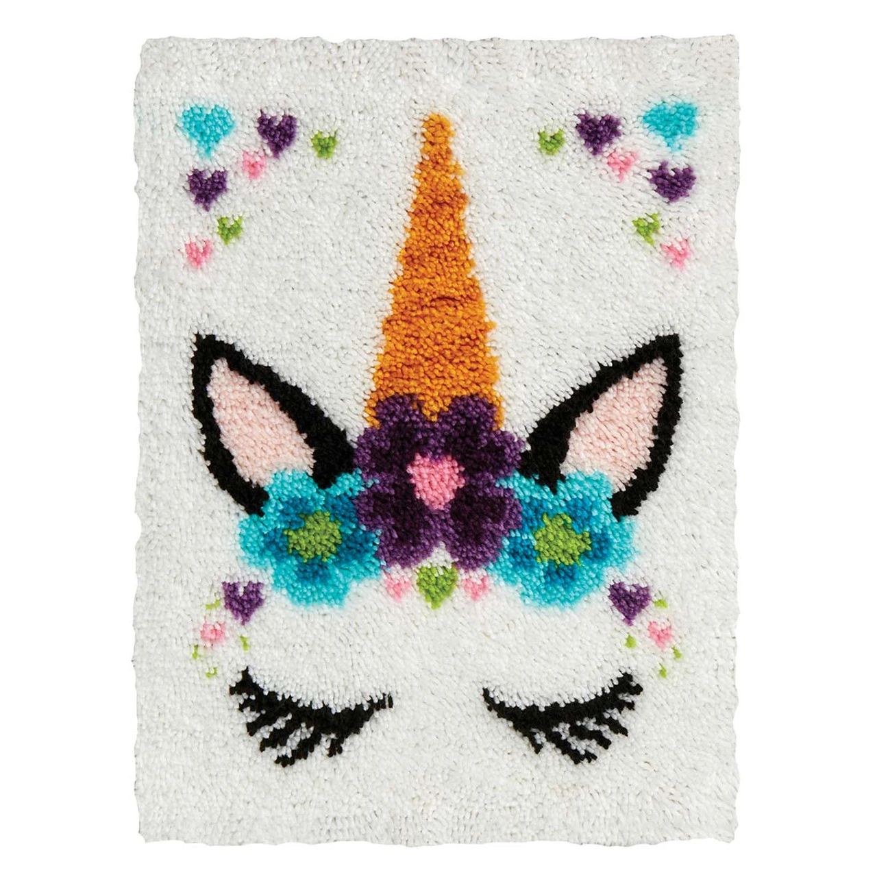 This whimsical latch hook design features a simple, minimalist unicorn face topped with a golden horn and a crown of blue and purple flowers. Miniature hearts in multiple colors are a sweet accent on this imaginative design. The finished project can be made into pillows, wall hangings, rugs, and more. Kit includes 3.75-mesh gridded canvas, lofty pre-cut 100% acrylic yarn, easy-to-follow chart, and instructions. Latch hook tool not included, rug binding, and non-slip backing not included. The higher-gauge canvas of this project allows for a high level of detail in the finished design. 20 x 27″ (51 x 69cm). Imported.
