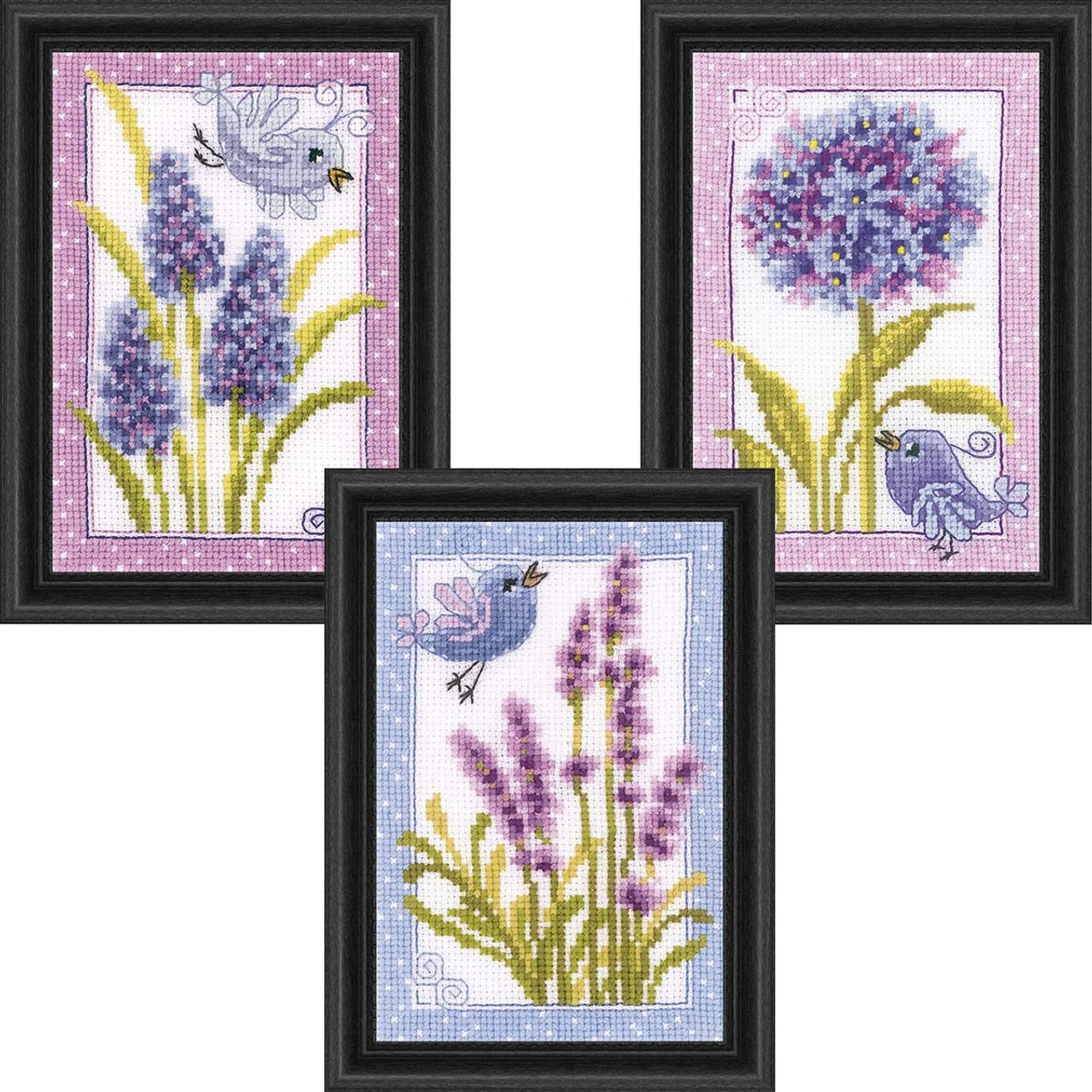 • Design feature little purple birds flying around lavender, hyacinth, and allium flowers framed in stitched purple borders.