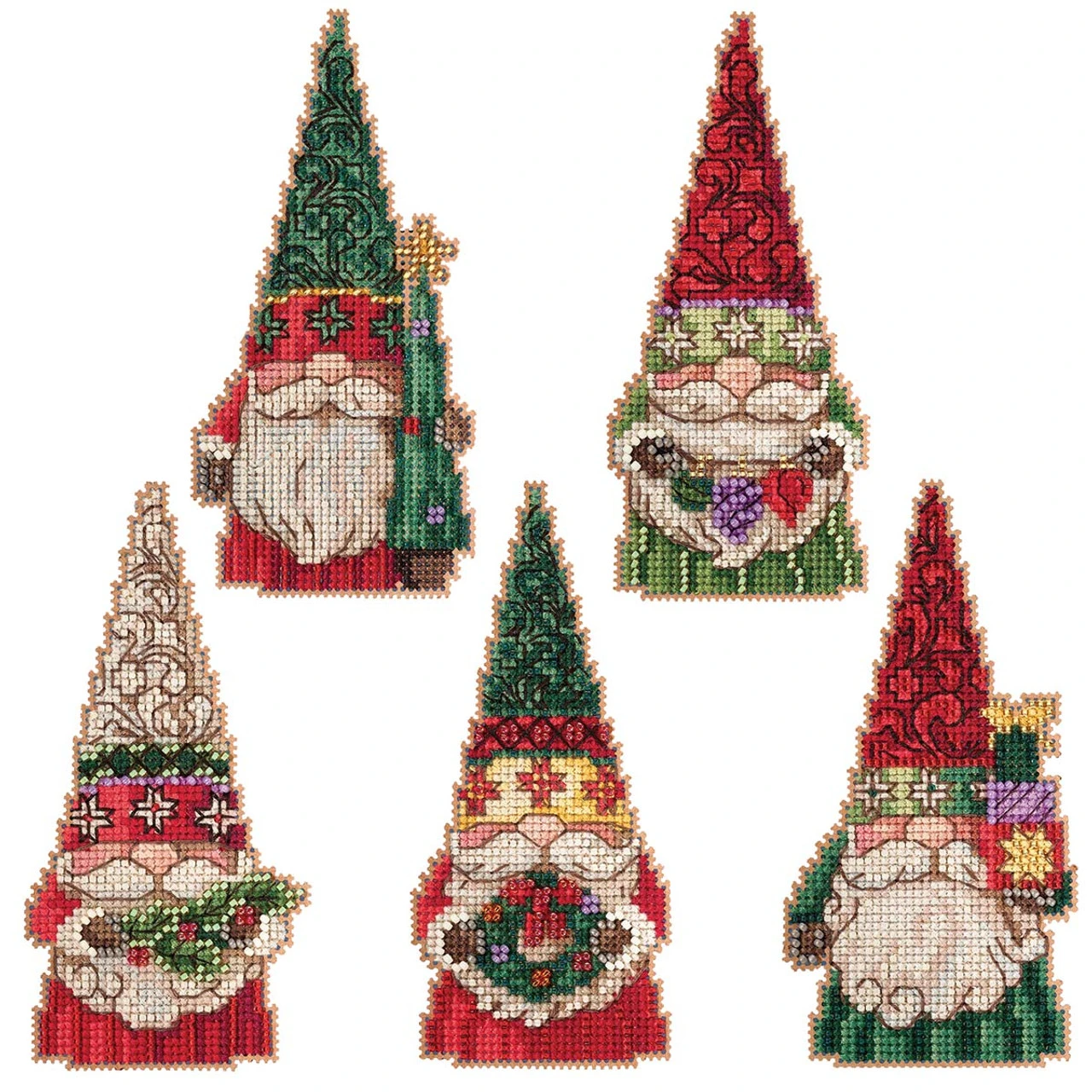 • Designs feature gnomes in tree-like hats holding boughs of holly, a garland of ornaments, a pile of Christmas presents, a wreath, and a Christmas tree.